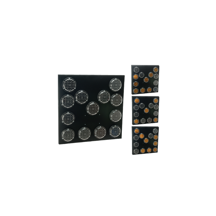Tablica kierunkowa montowana jest na pojazdach, maszynach, przyczepach pracujących w pasie drogowym. Panel wykonany jest z aluminium, na którym zamontowane jest 13 lamp LED ø 100mm. Zasilanie z akumulatora bądź z instalacji elektrycznej pojazdu. Moc świecenia: 100mm EN 12352 (class L2H) Zasilanie: 12V/24V Typ baterii: 60Ah/90Ah/180Ah Czas pracy: 20h/250/520h Rozmiar: 700x700x130 mm LED directional panel is made from aluminum and contains 13 LED lamps, diameter 100 mm. The device is used as a warning light and is usually placed on a rear of vehicles, machinery, trailer working/ blocking lane. Power supply is available from battery or from vehicle electrical installation.