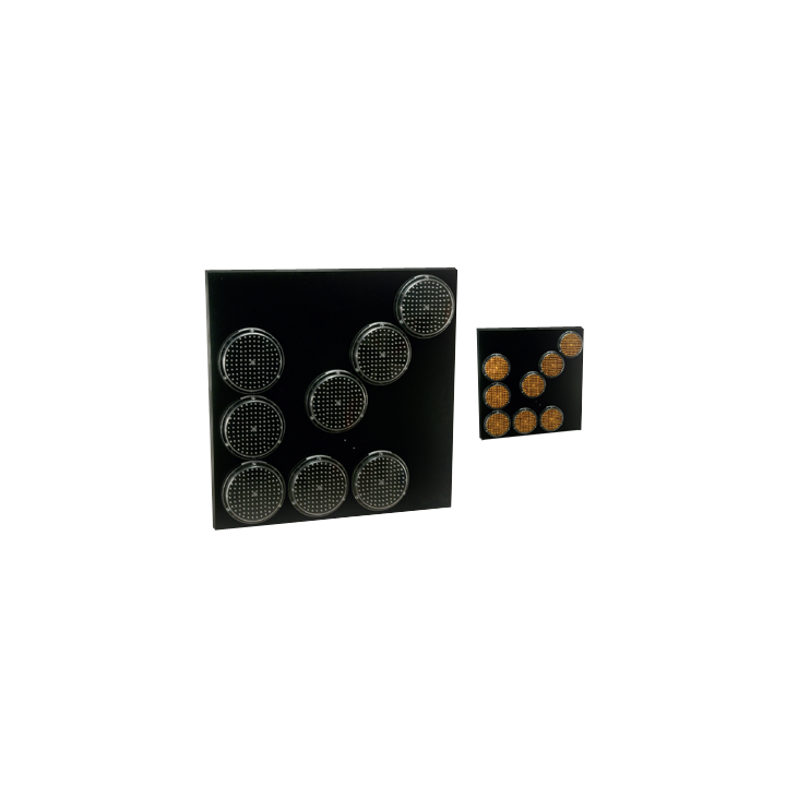 Tablica kierunkowa montowana jest na pojazdach, maszynach, przyczepach pracujących w pasie drogowym. Panel wykonany jest z aluminium, na którym zamontowane jest 8 lamp LED ø 200mm. Zasilanie z akumulatora bądź z instalacji elektrycznej pojazdu.Moc świecenia: 200mm EN 12352 (class L8H)Zasilanie: 12V/24VTyp baterii: 60Ah/90Ah/180AhCzas pracy: 35h/65h/130hRozmiar: 900x900x130LED directional panel is made from aluminum and contains 8 LED lamps, diameter 200 mm. The device is used as a warning light and is usually placed on a rear of vehicles, machinery, trailer working/ blocking lane. Power supply is available from battery or from vehicle electrical installation.